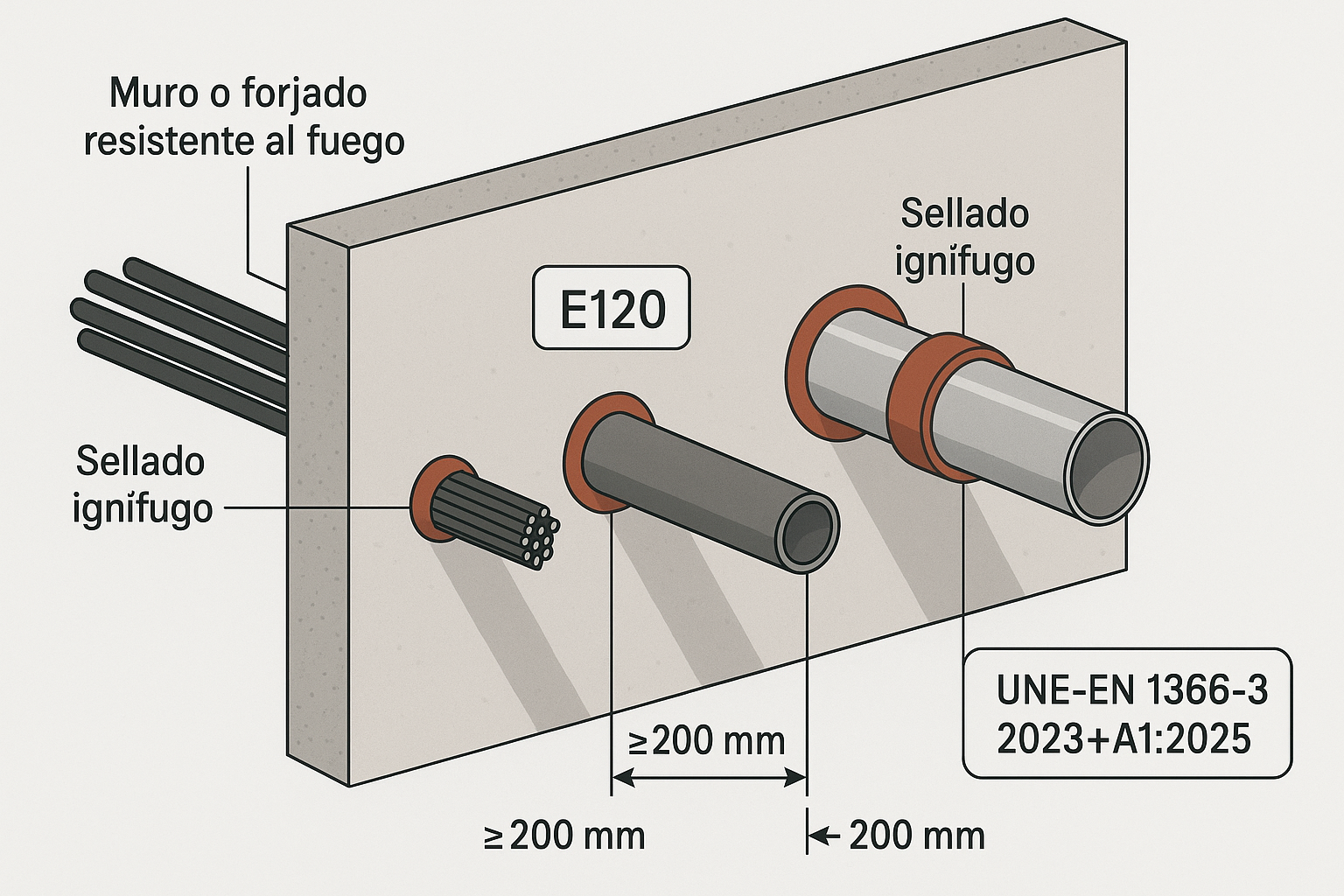 - Requisitos para sellados múltiples: Especifica distancias mínimas y configuraciones para combinar diferentes servicios (cables, tuberías metálicas o plásticas) en un mismo paso.