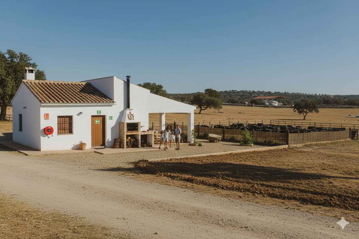 Un ejemplo inspirador es la Casa Rural La Capitana, ubicada en una finca ganadera de toros bravos en Almadén de la Plata, dentro de la ganadería Luis Algarra Polera. Su entorno natural es tan espectacular como exigente: un ecosistema de dehesa donde conviven tradición, fauna autóctona y el fuego como riesgo permanente.